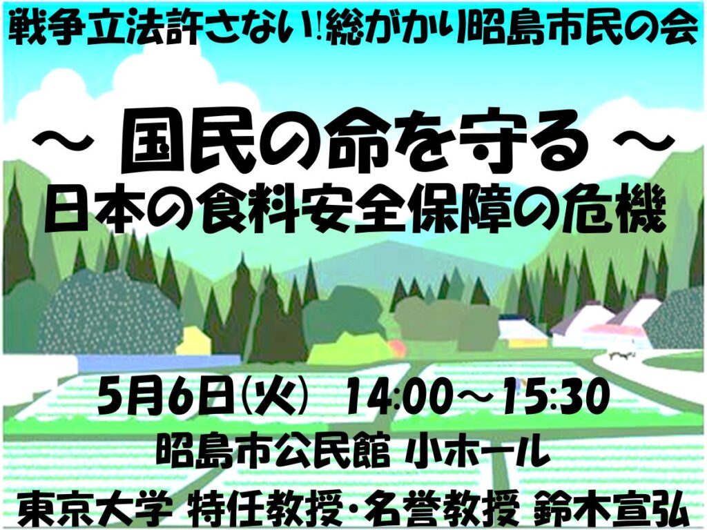 国民の命を守る(昭島市) 2025年5月6日 日時 2025年5月6日(火)14:00~15:30 会場 昭島市公民館小ホール 登壇/出演者 鈴木宣弘(東京大学大学院農学生命科学研究科特任教授) 概要 参加/視聴方法 主催者等