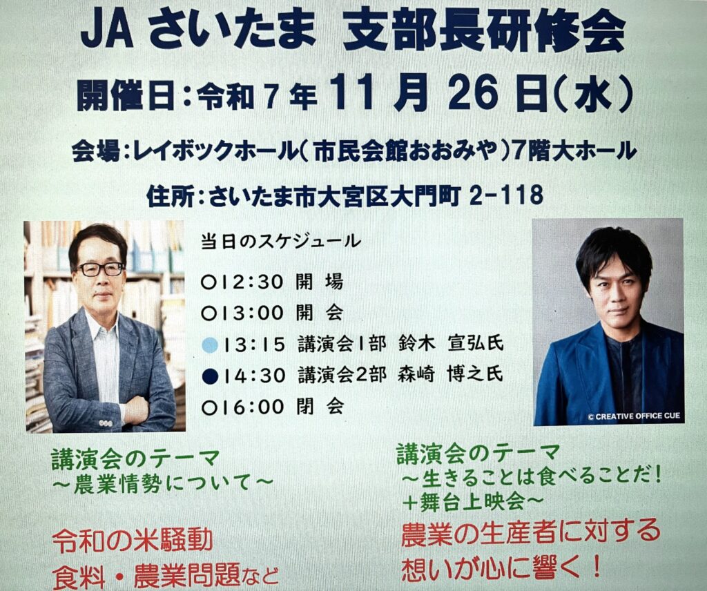 JAさいたま支部長研修会 2025年11月25日 日時 2025年11月26日(水)13:15~ 会場 レイボックホール7階大ホール 登壇/出演者 鈴木宣弘(東京大学特任教授・名誉教授) 概要 参加/視聴方法 主催者等