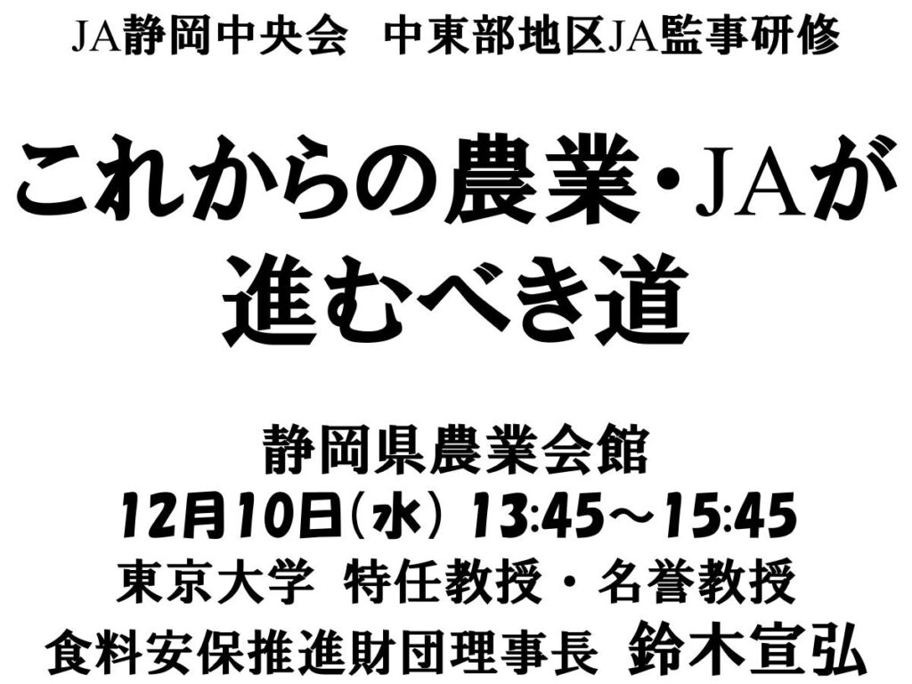 これからの農業・JAが進むべき道 2025年12月10日 日時 2025年12月10日(水)13:45~15:45 会場 静岡県農業会館 登壇/出演者 鈴木宣弘(東京大学特任教授・名誉教授) 概要 参加/視聴方法 主催者等