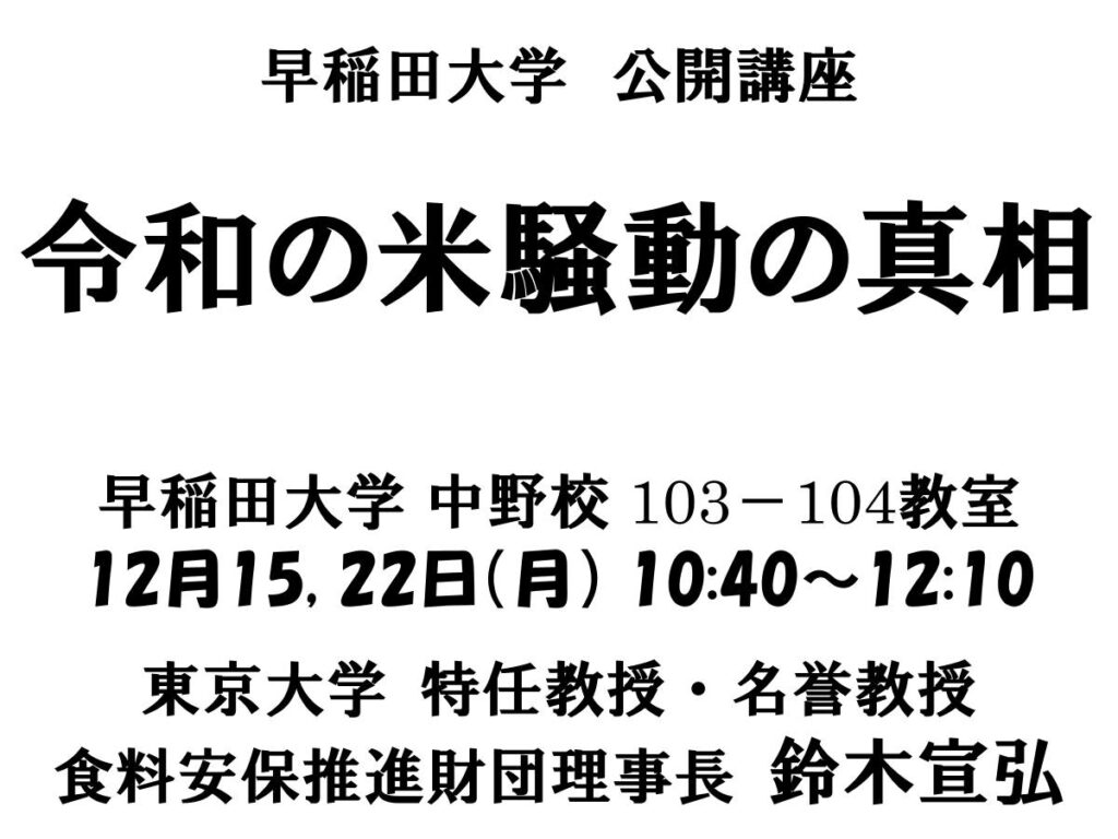 令和のコメ騒動の深層 2025年12月14日 日時 2025年12月15日(月)10:40~12:10 会場 早稲田大学中野校103-104教室 登壇/出演者 鈴木宣弘(東京大学特任教授・名誉教授) 概要 12月15・22日開催 参加/視聴方法 主催者等
