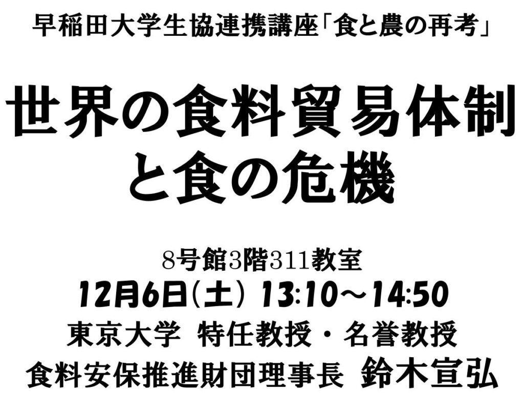 世界の食料貿易体制と食の危機 2025年12月6日 日時 2025年12月6日(土)13:10~14:50 会場 8号館3階311教室 登壇/出演者 鈴木宣弘(東京大学特任教授・名誉教授) 概要 参加/視聴方法 主催者等