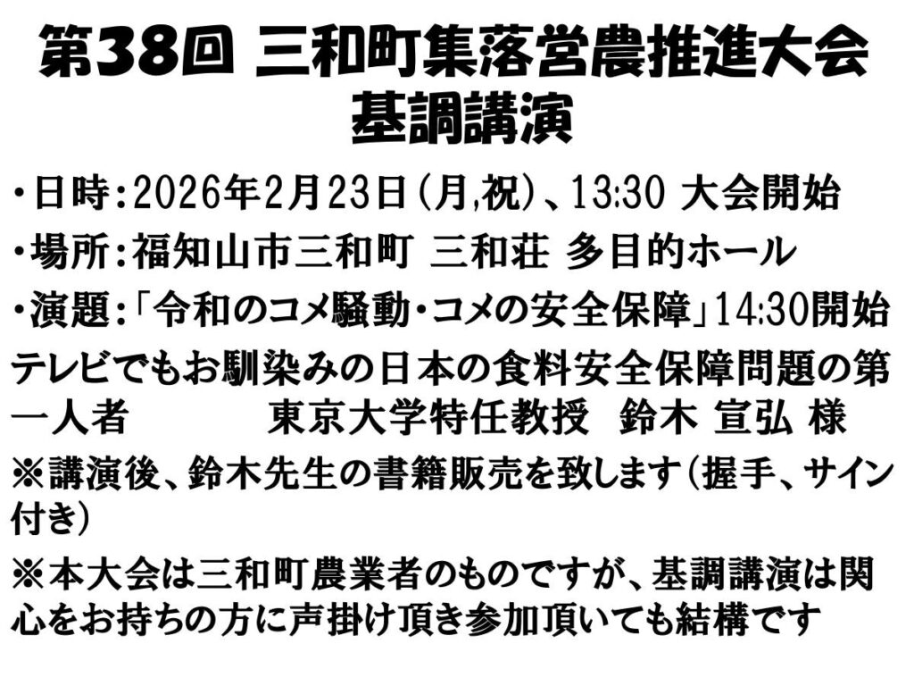 令和のコメ騒動・コメの安全保障(福知山市) 2026年2月23日 日時 2026年2月23日(月)14:30~ 会場 三和荘多目的ホール 登壇/出演者 鈴木宣弘(東京大学特任教授・名誉教授) 概要 参加/視聴方法 主催者等
