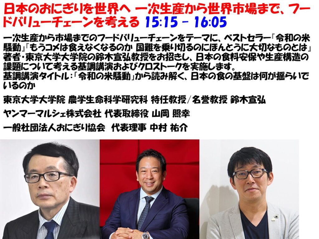 おにぎりサミットⓇ2026 2026年1月25日 日時 2026年1月27日(火)13:00~18:00 会場 東京ミッドタウン八重洲4階 カンファレンス 登壇/出演者 鈴木宣弘(東京大学特任教授・名誉教授) 概要 参加/視聴方法 主催者等