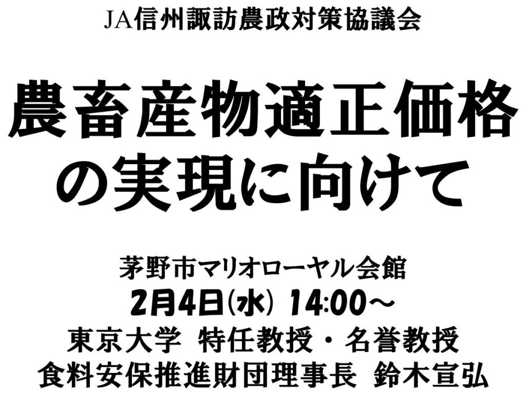農畜産物適正価格の実現に向けて 2026年2月3日 日時 2026年2月4日(水)14:00~ 会場 茅野市マリオローヤル会館 登壇/出演者 鈴木宣弘(東京大学特任教授・名誉教授) 概要 参加/視聴方法 主催者等