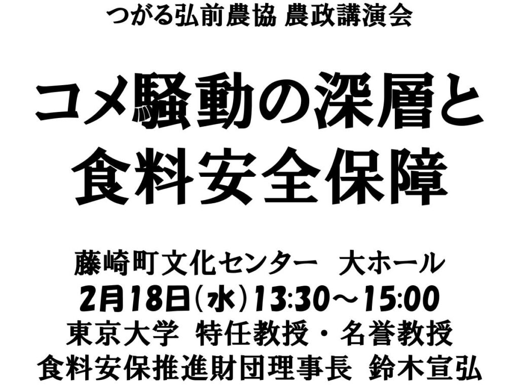 コメ騒動の深層と食料安全保障 2026年2月17日 日時 2026年2月18日(水)13:30~15:00 会場 藤崎町文化センター大ホール 登壇/出演者 鈴木宣弘(東京大学特任教授・名誉教授) 概要 参加/視聴方法 主催者等