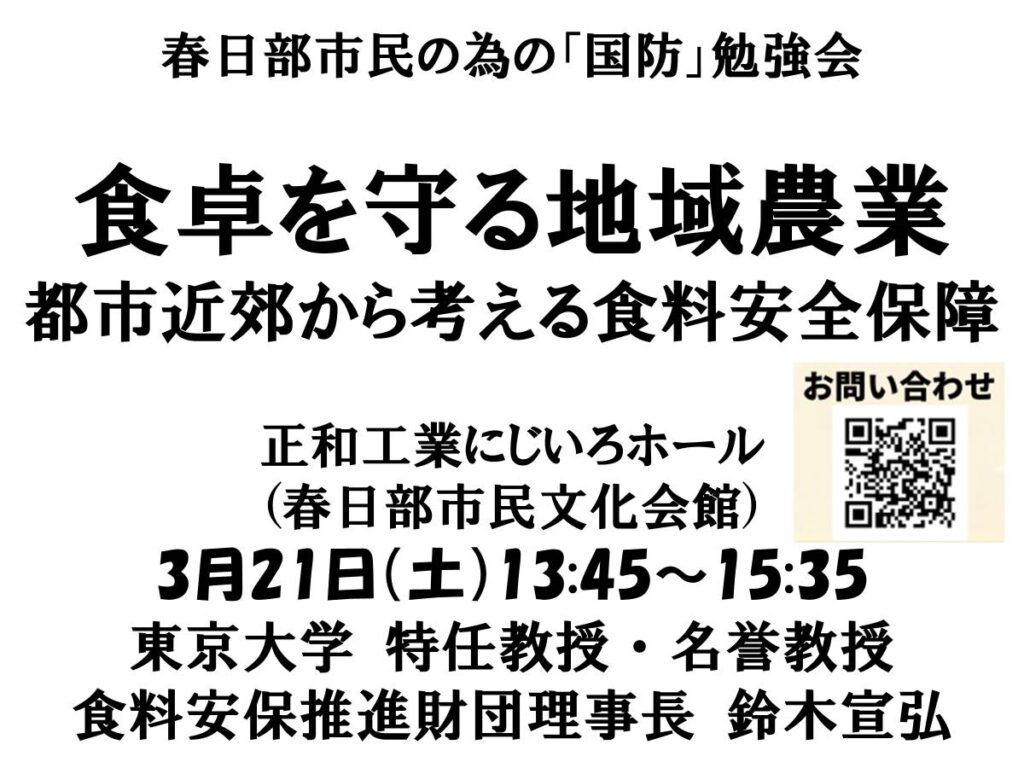 食卓を守る農業 2026年3月20日 日時 2026年3月21日(土)13:45~15:35 会場 正和工業にじいろホール(春日部市民文化会館) 登壇/出演者 鈴木宣弘(東京大学特任教授・名誉教授) 概要 参加/視聴方法 主催者等