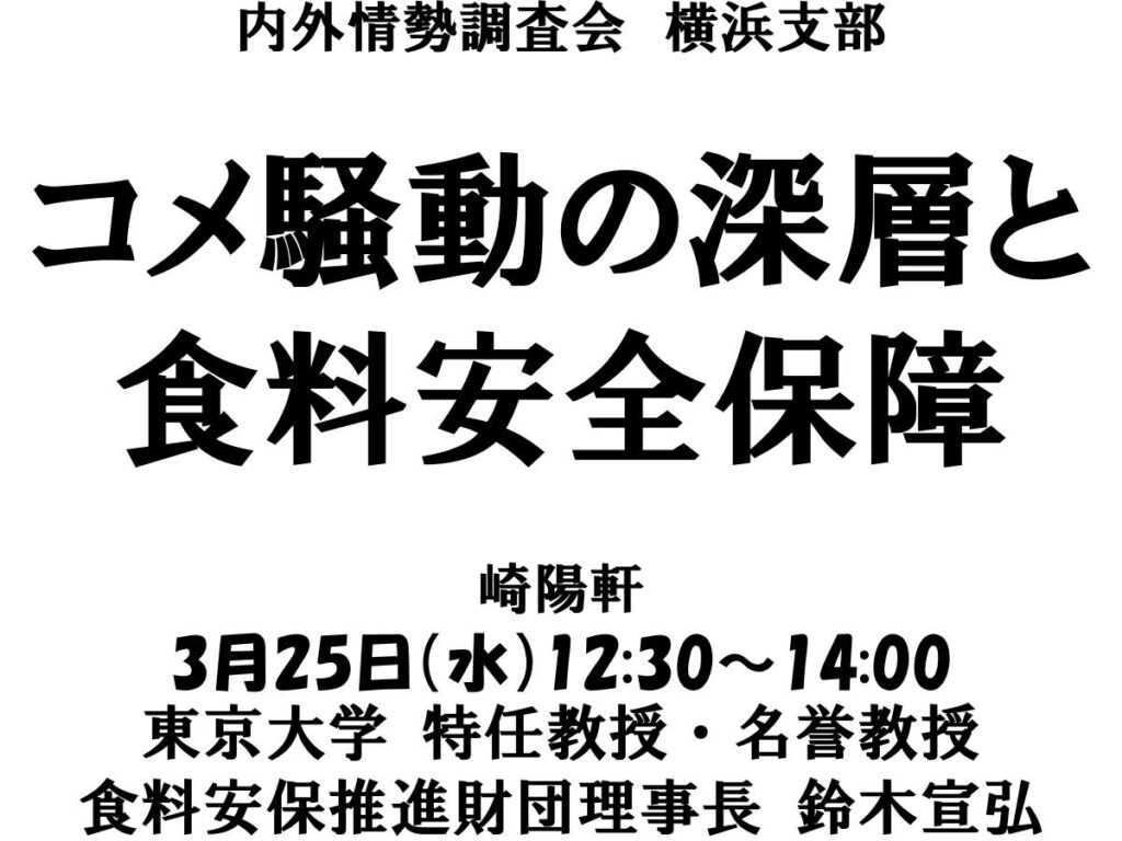 コメ騒動の深層と食料安全保障 2026年3月25日 日時 2026年3月25日(水)12:30~14:00 会場 崎陽軒 登壇/出演者 鈴木宣弘(東京大学特任教授・名誉教授) 概要 参加/視聴方法 主催者等
