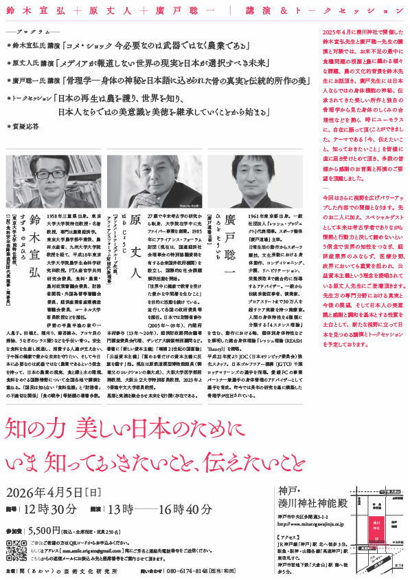 知の力 美しい日本のためにいま知っておきたいこと、伝えたいこと 2026年3月9日 日時 2026年4月5日(日)13:00~16:40 会場 神戸・湊川神社神能殿 登壇/出演者 鈴木宣弘(東京大学特任教授・名誉教授) 概要 参加/視聴方法 主催者等